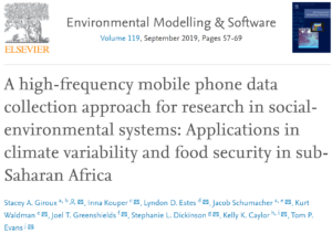 A new paper by Giroux et al., A high-frequency mobile phone data collection approach for research in social-environmental systems: Applications in climate variability and food security in sub-Saharan Africa, has just been published in Environmental Modeling & Software. The paper examines the potential for the collection of social-environmental data by farmers via short-message service (SMS), including the benefits in terms of timing and frequency of data collection, cost, and burden on respondents, as well as limitations with regards to data integration. The paper also presents the architecture for managing and processing heterogeneous data, tools to assess data quality, as well as visualization and analysis tools. It presents this work in the context of ongoing surveys of smallholder farmers in Kenya and Zambia. Access the paper here.