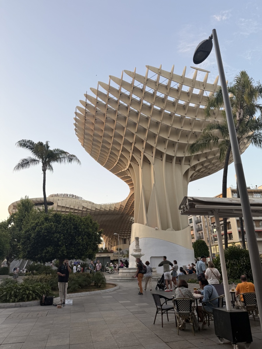 Dinner brought us to Holy Roll to get smoothies. While we were there, we took the time to admire the Metropol Parasol (commonly known as Las Setas or “The Mushrooms”), a massive contemporary wooden structure located in Plaza de la Encarnación. Designed by architect Jürgen Mayer, it’s one of the largest timber constructions in the world and offers a striking contrast to the surrounding historic buildings. The modern honeycomb pattern serves as a bold architectural gesture—and a unique example of Sevilla’s blend of old and new.