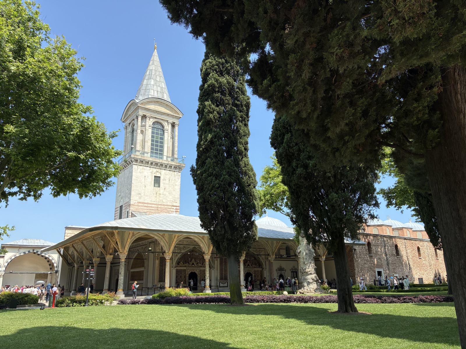 We entered the Topkapı Palace (or “Tan Gate” Palace, referencing its main entrance) ahead of a line winding around the block to gain entrance to the historic complex. Its first Ottoman building phase was initiated in the 1450’s by Mehmet the Conquerer. The complex’s buildings are organized around four central courtyards, each with their own grandly decorated entrance gates. Renovated continually by successive sultans, most of the current architecture left is from the 16th century, but aesthetics throughout the palace include Ottoman, Byzantine, Neo-Classical, and even Rococo influences. This wide range reveals the Ottoman empire’s international relationships, but also its desire to convey its power and influence through the same visual language of Western empires. Another important element of the Palace’s architecture is that, from the main entrance to the last courtyard, the entrances, courtyards themselves, and buildings become less accessible, and more private spaces, as public courts make way for the Sultan’s private residences.