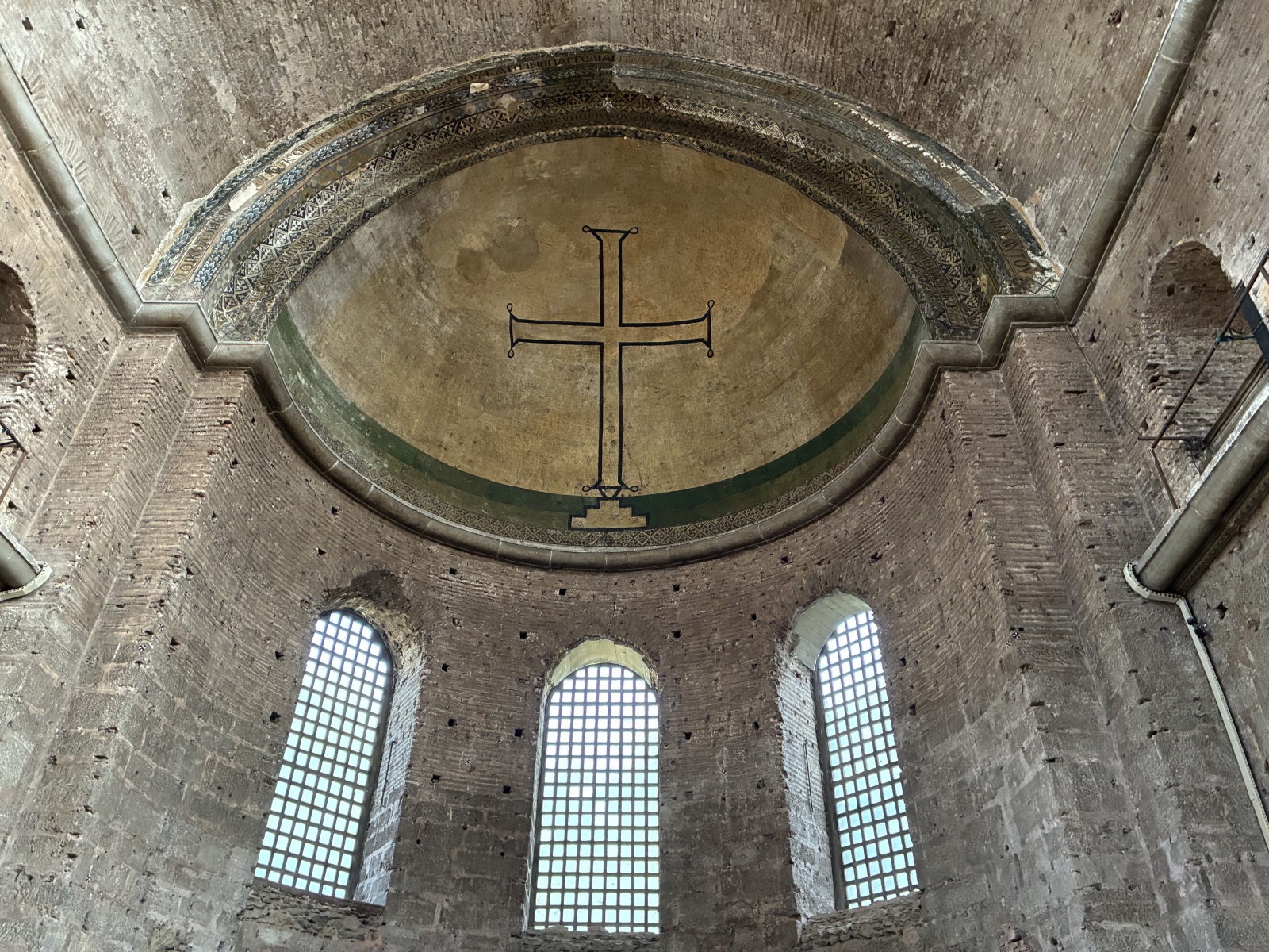 In the courtyard outside of the Topkapı Palace sits the Hagia Eirene (which visitors can gain free access to with their palace ticket!). Meaning “Holy Peace,” the church, originally Eastern Orthodox, is the oldest of its kind to still stand in all of Turkey. It is also one of the only Byzantine churches that was never converted into a mosque, making it a unique landmark. Originally built around 532 C.E., it was converted into a weapons armory by the Ottomans after the capture of Constantinople in the mid to late 15th century. This is evidenced by a strange painting in the main dome, which depicts various weapons and instruments. The only other painting is in the apse on the east side of the church of a large black cross against a yellow background. Unassuming upon first glance, this work is invaluable to our understanding of medieval history, as it is the only imagery in any church that remains from the iconoclastic period of the 8th and 9th centuries. In the 20th century, the church was designated as an archeological site, but also became a center for culture, as concerts and other big events were held in the historic building. Today, however, it is silent, covered in old scaffolding and detritus, isolated from everyday life in Istanbul.