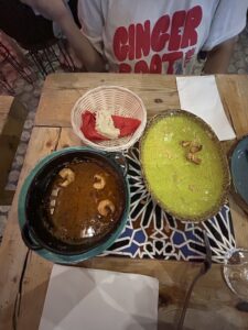We got a table and ordered, you guessed it, patatas bravas. We also got Gambas al Ajillo, a dish of shrimp cooked in a mixture of hot oil, garlic, and paprika. I am usually not a big shrimp guy, but I am so glad we ordered these. They were so good. Gabby and I even splurged on some bread to soak up the rest of the oil.