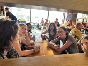 At some point, the German guy in the aisle seat got up to use the bathroom. I saw the guy in the window seat glance over at the aisle guy’s departure, and before the window guy had to ask me anything, in an act of understanding we also both got up to use the bathroom. Trudging through the aisle, I saw Kacie watching Top Gun, Gabby watching Quiet Place: Day One and Dr. Pitamber typing away on her computer. The row 21 reunion in the back of the plane was uneventful, but it was good to stretch my legs.