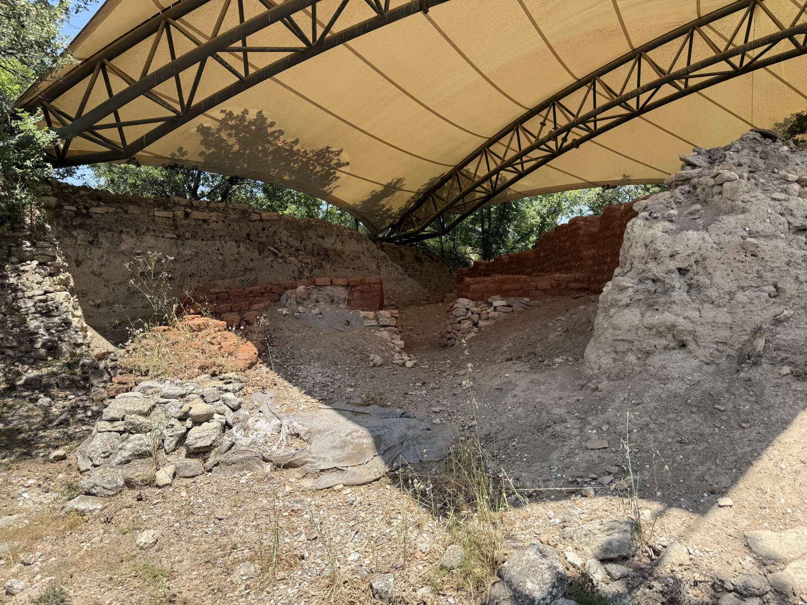 We then arrived at the Citadel Wall of Troy II/III. The modern restoration uses handmade and fired mudbricks to shield the fragile remains of the ancient clay bricks underneath, which have been preserved up to a height of nearly four meters. A protective canopy, built in 2003, shelters both the wall and the megaron just opposite, allowing visitors to observe these structures without further risking their deterioration.