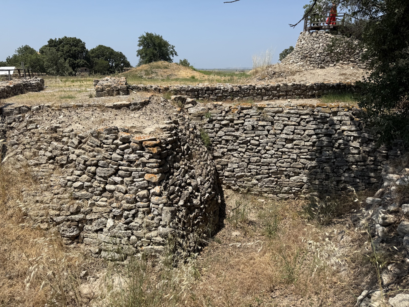 We then arrived at the Citadel Wall of Troy II/III. The modern restoration uses handmade and fired mudbricks to shield the fragile remains of the ancient clay bricks underneath, which have been preserved up to a height of nearly four meters. A protective canopy, built in 2003, shelters both the wall and the megaron just opposite, allowing visitors to observe these structures without further risking their deterioration.