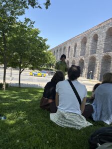 Next up, we made our way to the Aqueduct of Valens, where Gabby was going to do their presentation! It was fantastic, and I was so intrigued to learn more about the first Roman-era Aqueduct I had ever seen. Built in the 4th century during the reign of Emperor Valens, this historic water system rose to 96 feet high and was about 1 kilometer long originally. Under the Byzantine rule, the aqueduct transported around 16 million gallons per day to the city from springs outside the city. It spanned from the hills of Fatih and the Third hill and was extended under the Ottoman sultans, including Suleiman the Magnificent. Currently, about 921 meters remain of the Aqueduct, and it can be seen as a bridge-like structure, with arches that now separate lanes of traffic.
