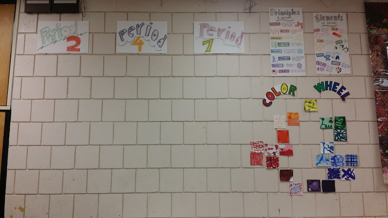 Part of the classroom wall before student work was displayed. A visual aid of the principles and elements of design are posted, as well as a student-made collaborative on-going color wheel.