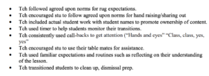 Explanation: Throughout this year I have worked to develop intentional routines to support physical and emotional safety. More information on the classroom norms and routines implemented can be found in my Portrait of Classroom as a Learning Community under characteristics and development, norms and values.