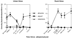 in 1993, graduate student Mark Berman and I performed a sampling survey along the east coast of Florida, collecting mosquito larvae in discarded tires (among other container habitats) from the center of each county. Along with the records obtained by mosquito control workers throughout Florida, we were able to see that Aedes aegypti abundance declined in relation to the time since Ae. albopictus had first been reportede. Data for six counties in which Ae. albopictus was reported are shown below, ranging from 7 years (Duval Co.) to 0 years (Broward Co.) are shown below, for urban and rural sampling locations near the center of each county (Bergman and Livdahl, Unpublished).